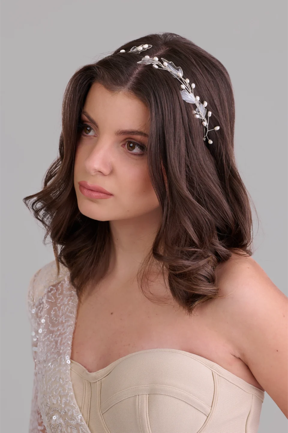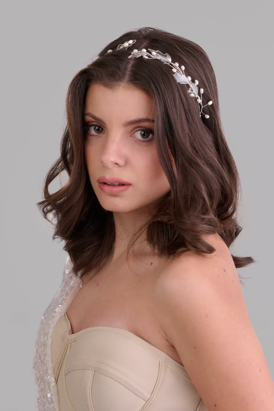 Диадема с бели листа и капковидни перли