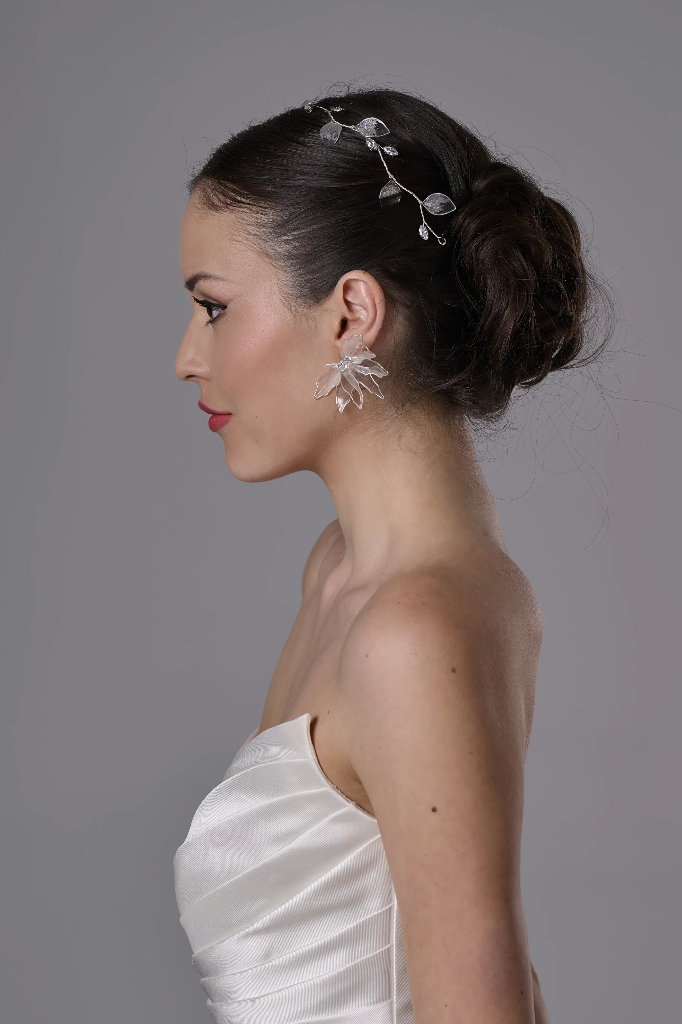 Дизайнът е изграден от кристални листа с деликатен блясък и матов финиш, допълнени от листовидни цирконии, които улавят светлината и създават фин, луксозен акцент без натрапчивост. Сребристата тел подчертава чистотата на формите и прави аксесоара изключително подходящ за светли, пастелни и класически визии.