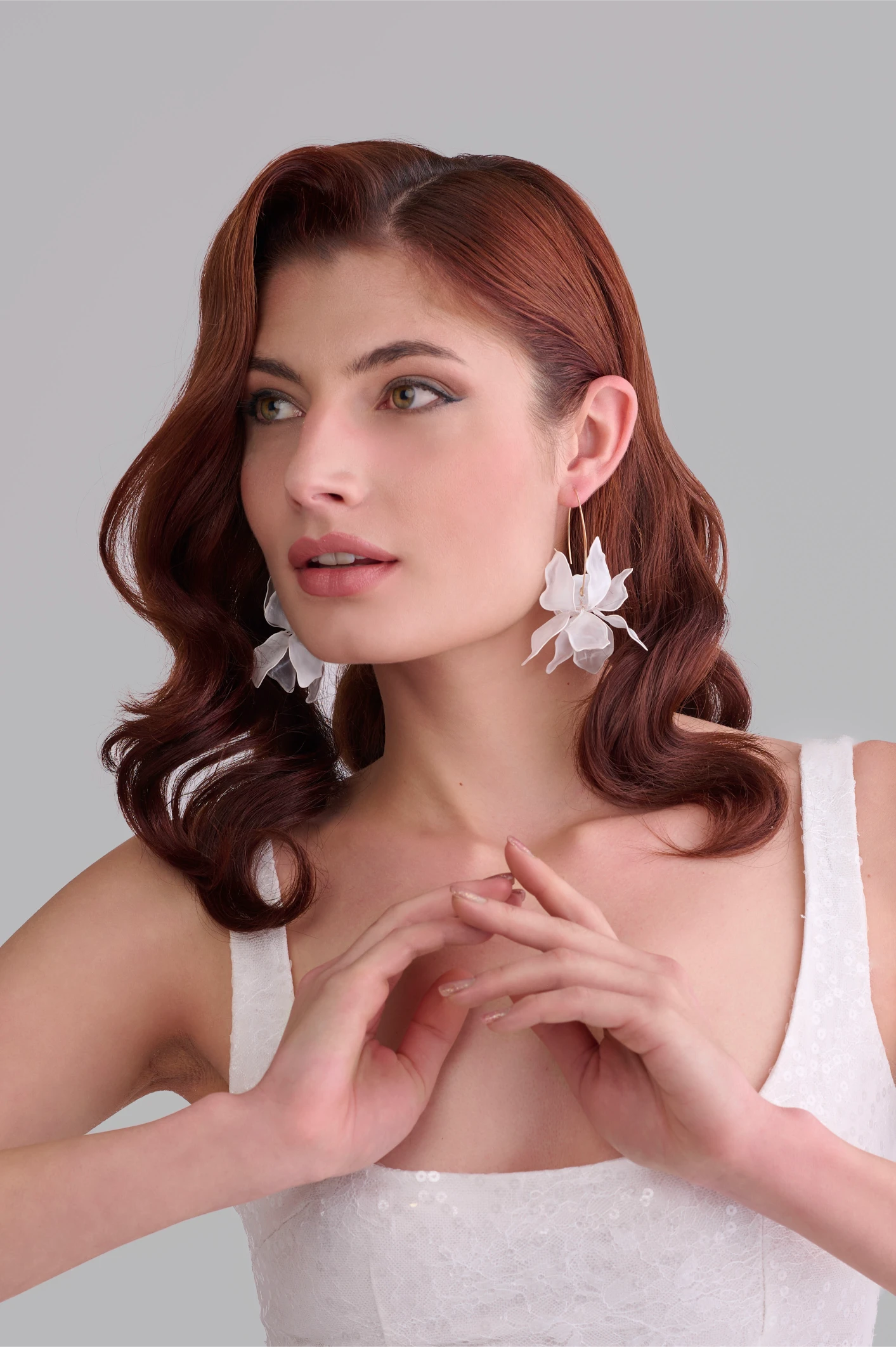 Ръчно изработени бели обеци „Ирис“, вдъхновени от красотата на природата. Леки и ефирни, с дължина 10 см, те са идеални за булчински визии и елегантни бижута. Куката е от сребро 925, а за допълнителен изискан акцент се предлага и вариант със златна кука (сребро с позлата).