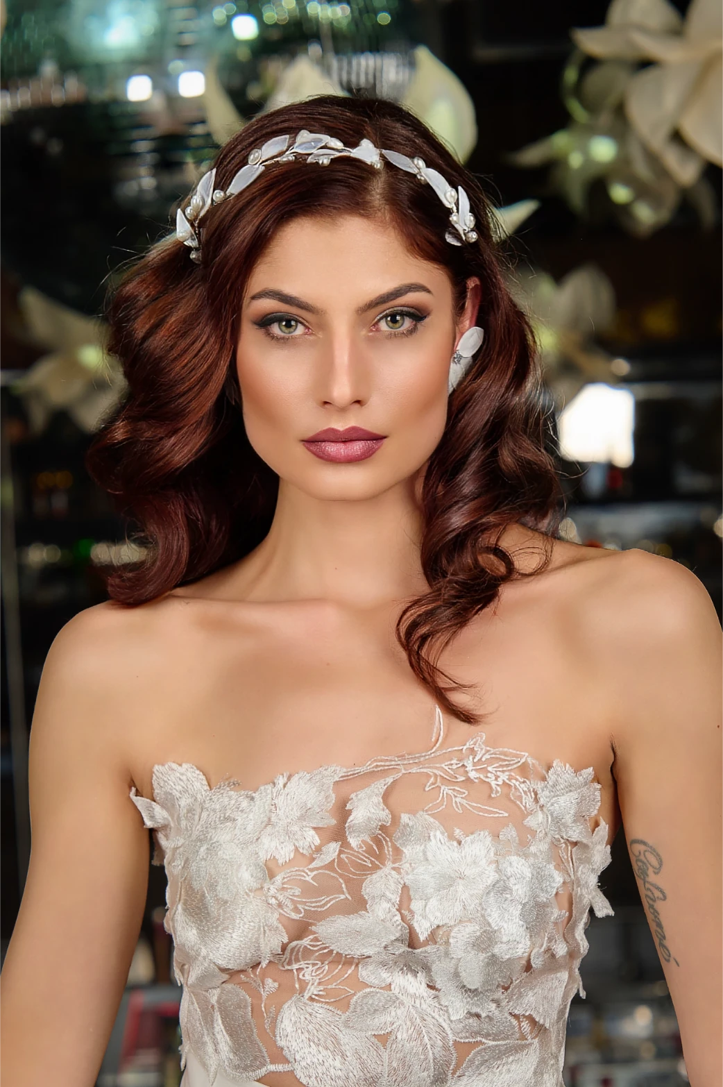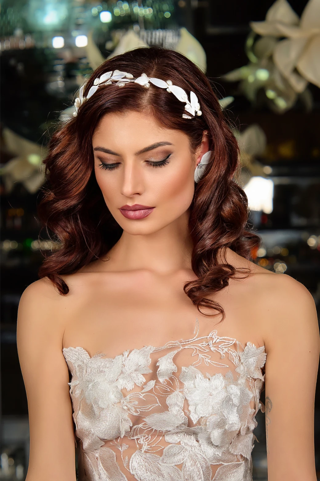Нежна и изискана диадема с бели листа и капковидни бели перли, идеална за всяка булка, която търси изящество и стил на сватбения си ден. Изработена от висококачествени материали, тази диадема ще подчертае красотата на вашата прическа, добавяйки лукс и елегантност. Перфектен избор за сватбени бижута и аксесоари за коса, които придават на всяка визия финес и нежност.