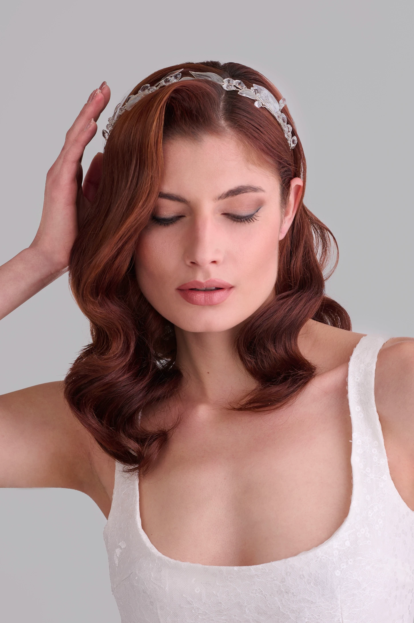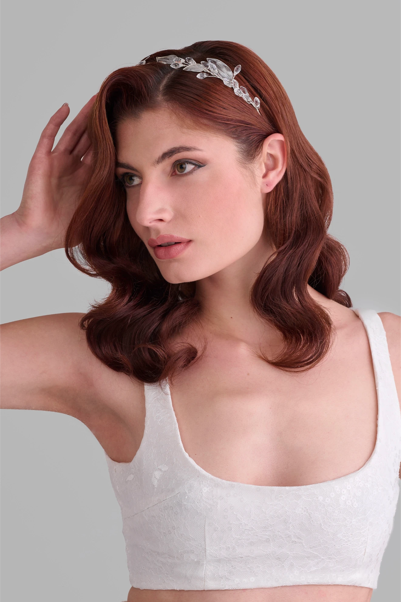 Фина диадема с кристални листа, украсена с пръски сребърно и лек мат, допълнена с кристали. Нежна и елегантна, създадена за стилна булчинска визия.