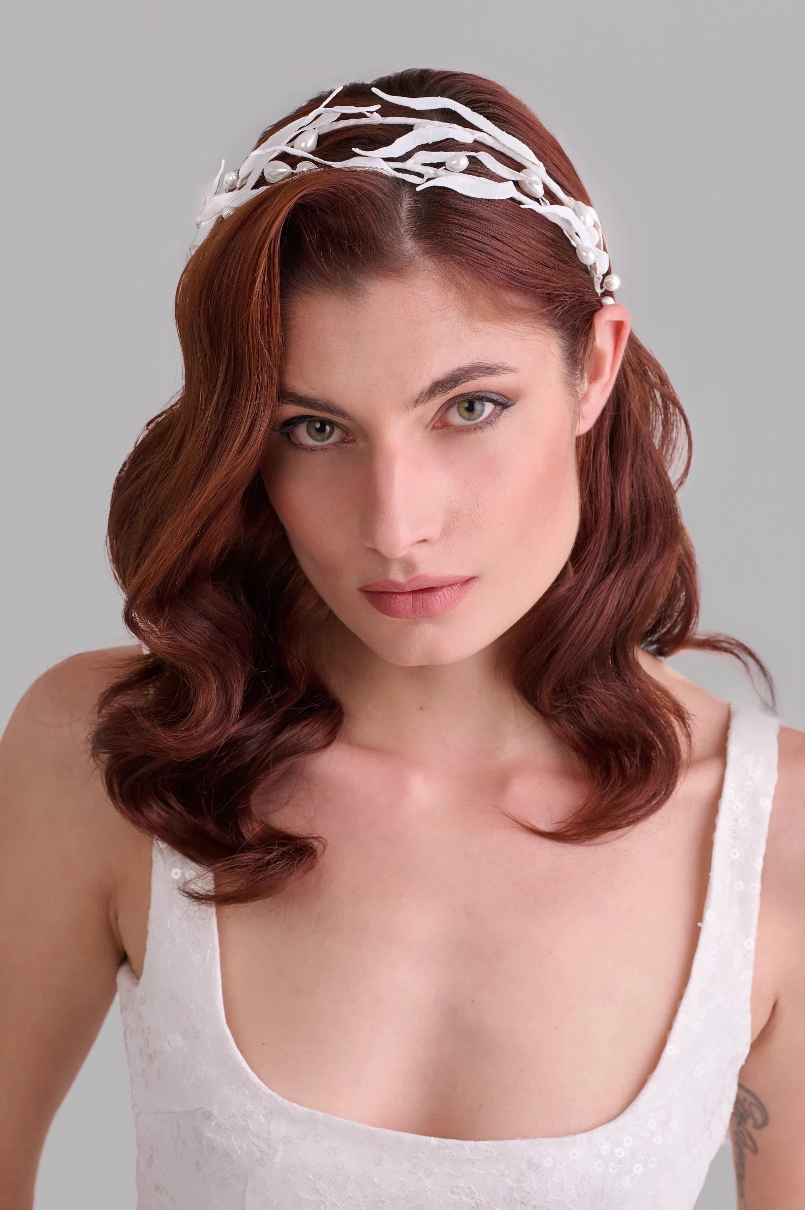 Двойна диадема с тънки грапави листа и капковидни перли.