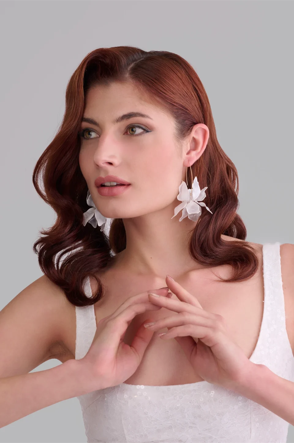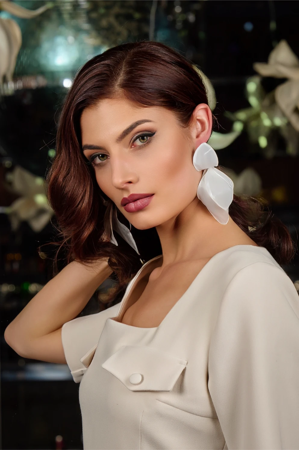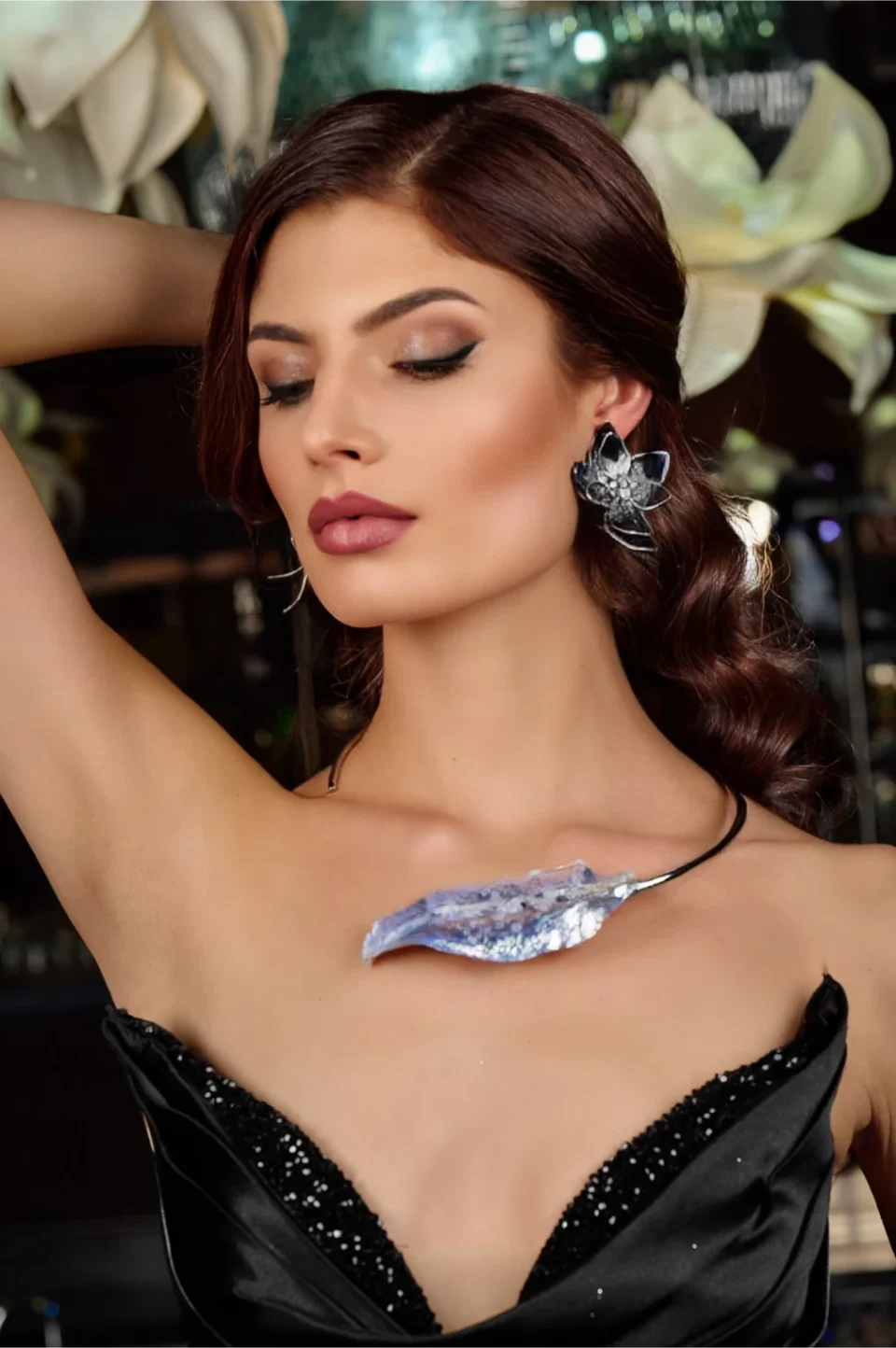 Тези уникални артистични обеци с дължина 13 см променят формата си в зависимост от ъгъла, под който се гледат. Отпред изглеждат като големи разцъфнали цветя, но при движение и завъртане разкриват форма, наподобяваща богомолка.